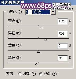 4、創(chuàng)建可選顏色調(diào)整圖層,對白色進(jìn)行調(diào)整,參數(shù)設(shè)置如圖6,效果如圖7。
