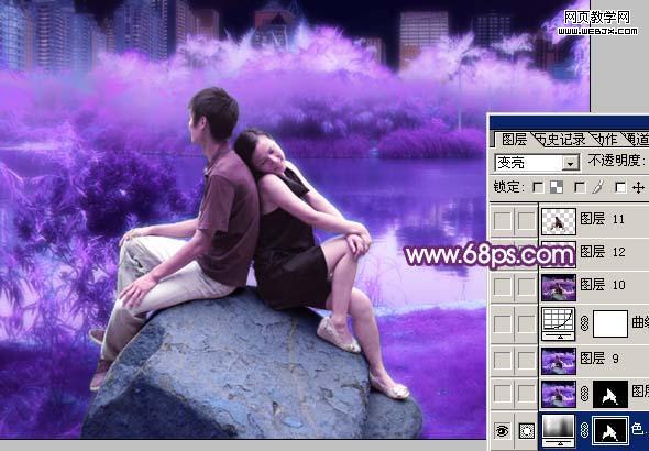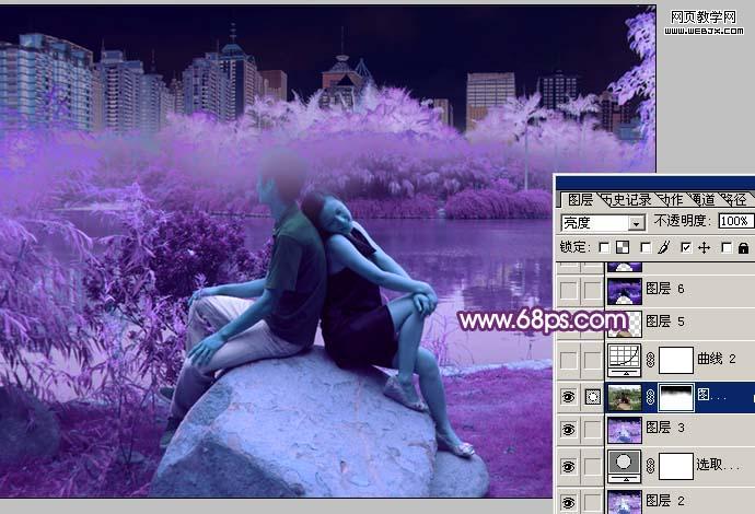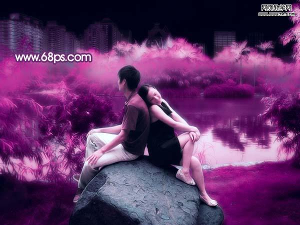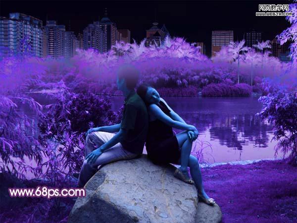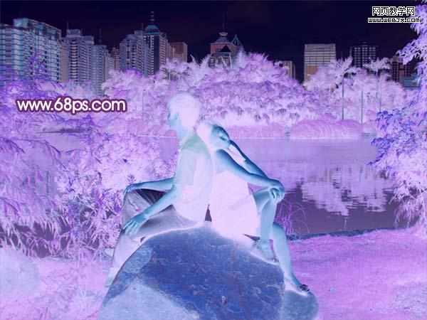 本教程色調(diào)以紫色為主。原圖素材較為明亮,不過經(jīng)過反相處理后,效果就非常接近夜景照片。只是圖片的局部有反白效果。需要慢慢去修復(fù)。