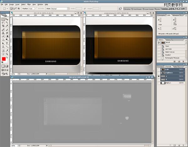 在a通道里把三個區(qū)塊都選擇上,打開色階窗口(ctrl+l 或 圖像>>調整>>色階)。將中間的滑塊向左邊移動,這樣副本里的微波爐的顏色就和原始的圖像非常接近了(這里我把中間的滑塊移到1.08的位置)。b通道進行同樣的處理,現在的效果應該是這樣的: