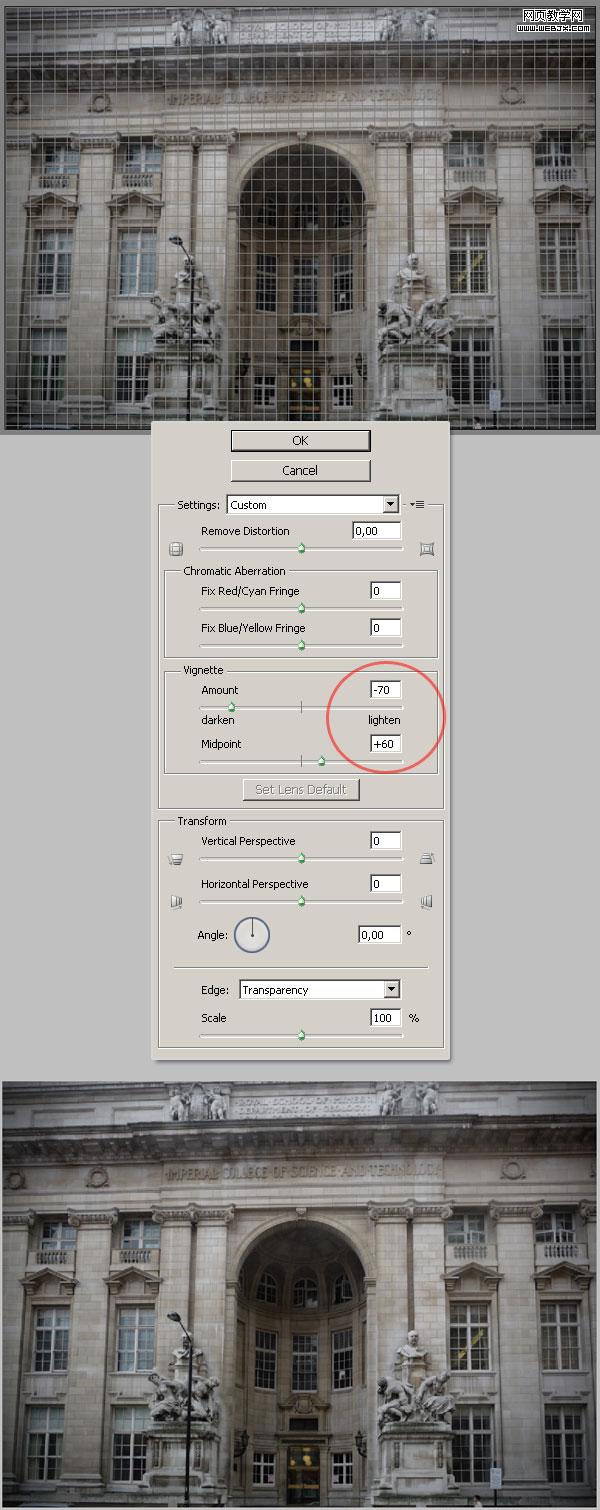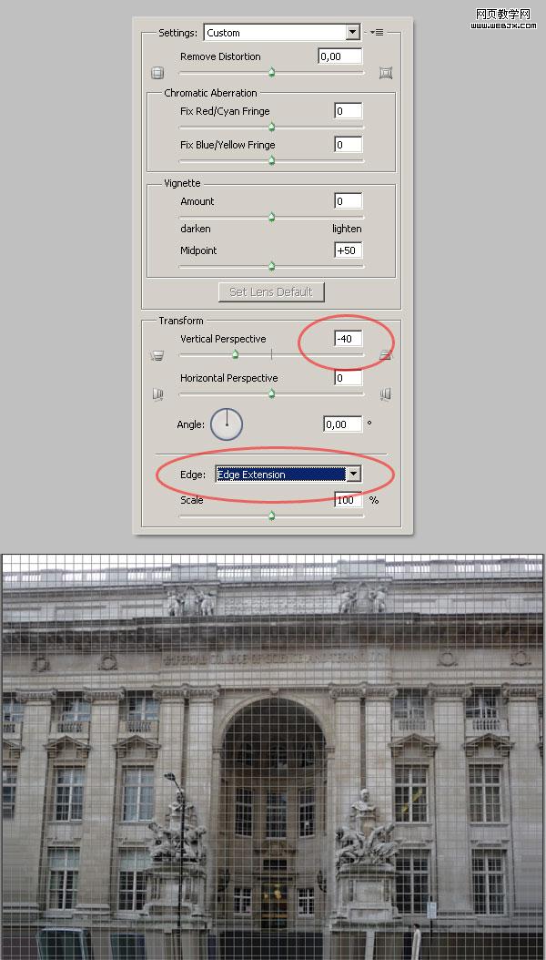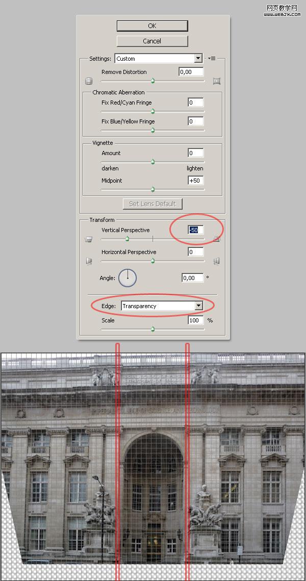 這次,我們會在0-50的范圍內(nèi)改變垂直透視。數(shù)值自定,取決于你編輯的圖像。將“邊緣”(edge)設(shè)置為“透明度”(transparent),這意味著不會自動往圖像邊緣添加像素。我參考網(wǎng)格,憑感覺調(diào)整了扭曲。