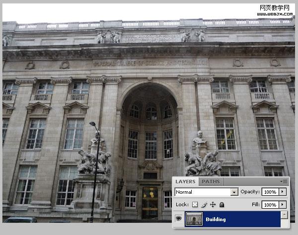 對于本教程,您需要下載此照片或任何其他有透視形變失真的照片。打開文件,雙擊“背景”層使其可編輯,修改其名稱為“建筑”。