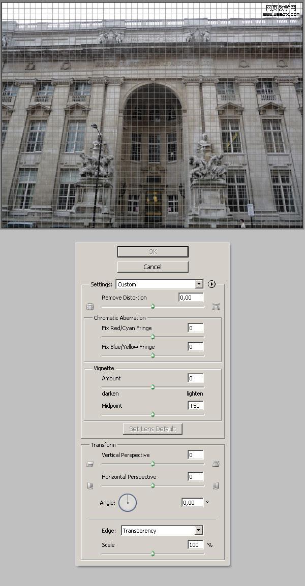 “ 濾鏡”-扭曲-鏡頭校正。(譯者注:因為拿不準大家用的是英文版還是中文版,忽略大五版之后,我決定在必要的地方加上英文文。鏡頭校正這個濾鏡可不太常用 吧,哈。)( filter > distort > lens correction)在鏡頭校正窗口中,您會看到一個網(wǎng)格壓著的圖片和右側(cè)的幾個選項。我們將使用右側(cè)的選項來矯正照片。