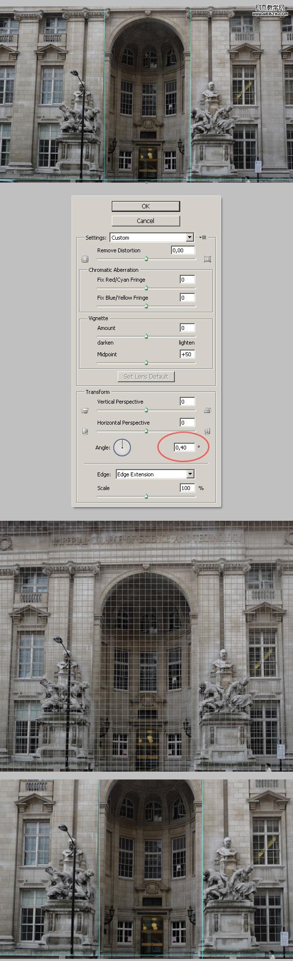 你可以拉幾條參考線看看滿意不。我拉了兩條豎線,一條橫線。很明顯,地基不是水平的,我們得再用鏡頭校正濾鏡修一次。“濾鏡”-扭曲-鏡頭矯正。然后將角度調(diào)整為大約四度。