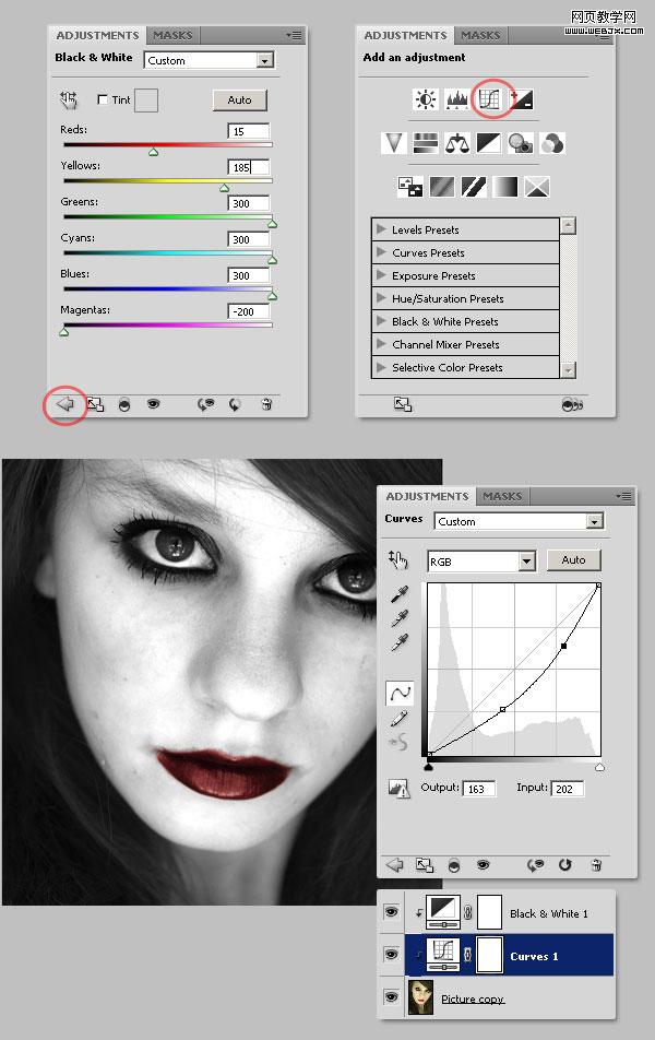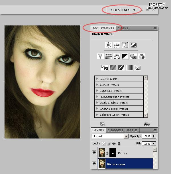 “窗口”-“調(diào)整圖層”,顯示cs4的調(diào)整面板。也可以單擊photoshop窗口右上角并選擇的“基本功能”,默認(rèn)會顯示調(diào)整面板。我們將使用這個面板給“圖 副本”圖層添加幾個調(diào)整圖層。選擇“圖 副本”,開始下一步。