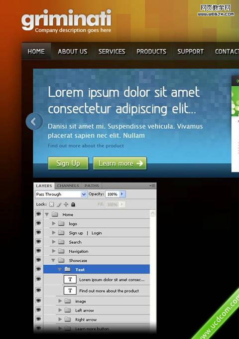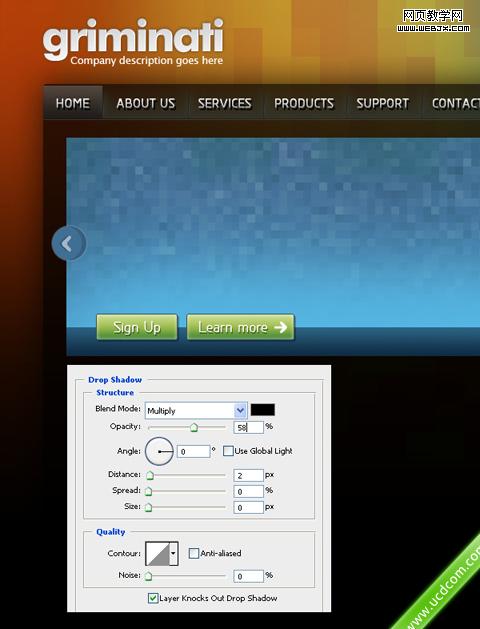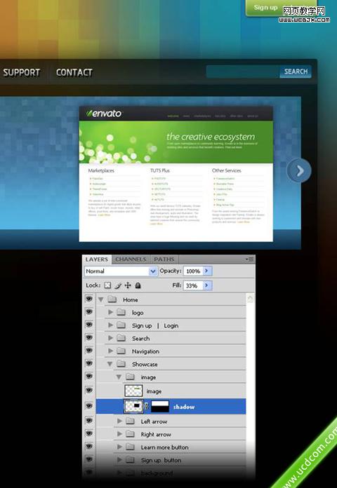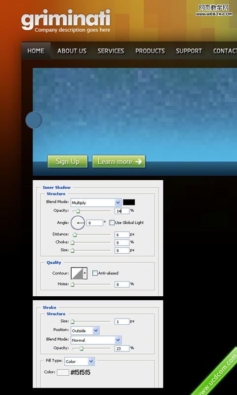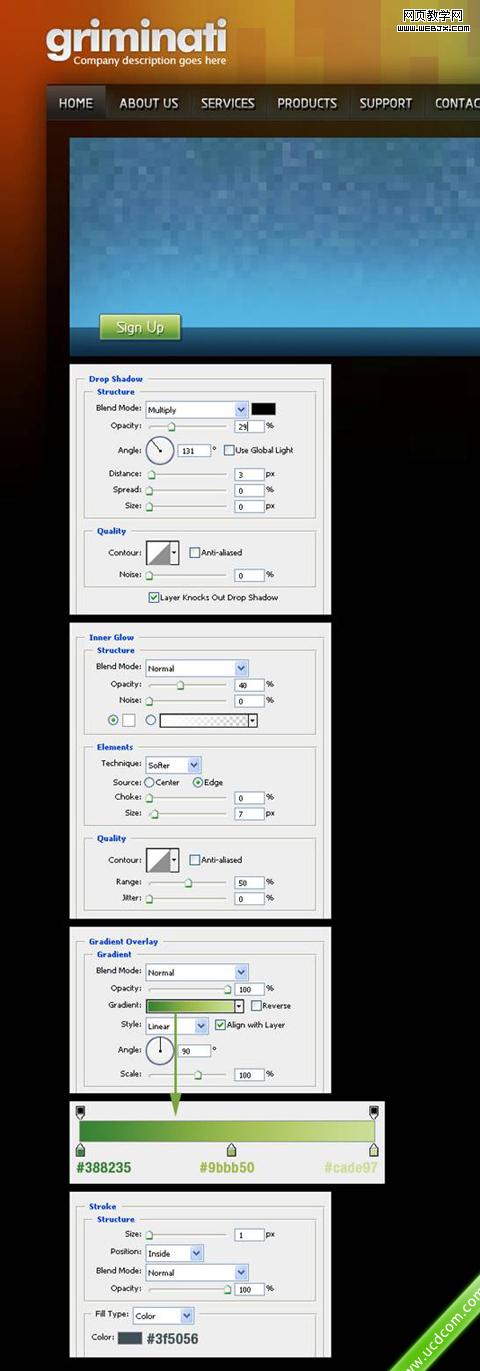 步驟29:創建一個新組,并將其命名為“sign up button”按鈕。選擇圓角矩形工具(ü) ,設置半徑為2像素,并創建一個圓角矩形想我做到了。雙擊該層,打開圖層樣式窗口的設置。然后選擇文字工具(t)寫 “sign up”使用白色。