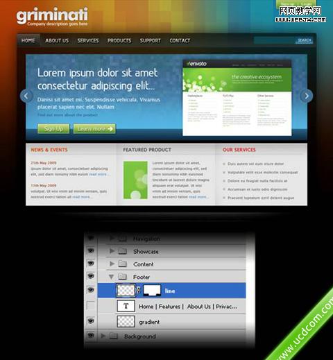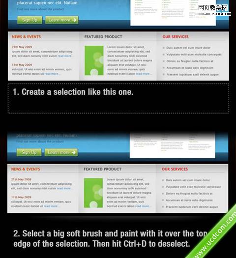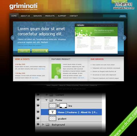 步驟42:創建一個的頁腳 。創建一個新組,并將其命名為"footer" 。創建一個新的層,選擇矩形選框工具( m )擇。然后設置前景顏色為# 555555 ,選擇一個大軟刷。設置這一層不透明的50 % ,并將其命名為"gradient." 。