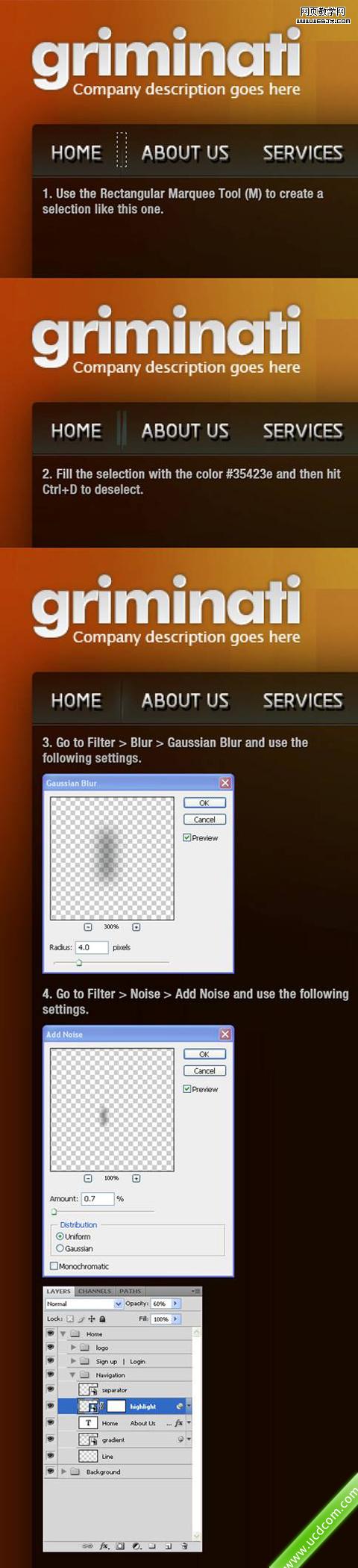 第16步:在“separator”層下方創建一個新層。選擇矩形選框工具(m) ,創建一個選擇就是這樣從以下圖片和填補它的顏色#35423e 。右鍵單擊該層,并選擇轉換為智能對象。進入過濾器“模糊”高斯模糊。然后進入過濾器> “噪音> ”添加噪音,并再次使用的設置以下的形象。設置這一層不透明的60 % ,并將其命名為“highlight”