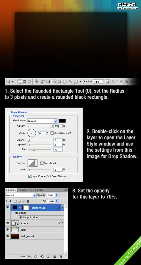 第4步:創建一個黑色的背景,創建一個新層,選擇圓角矩形工具( ü ) ,設置半徑為3像素,并創建一個圓形黑色矩形。然后雙擊在此層,打開圖層樣式窗口的設置和使用的下列圖像陰影。設置這一層不透明為70 % ,并將其命名為"black shape"
