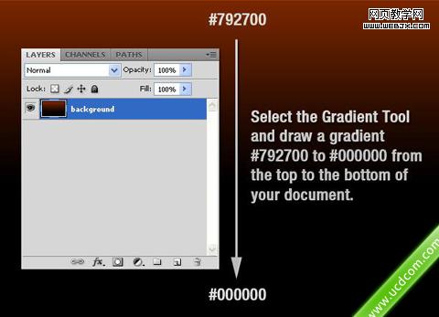 第1步:創建一個新文件(按ctrl + n )大小為1200px,750px 。然后背景顏色選擇漸變工具( g )從#792700到#000000從頂部向底部的文件。
