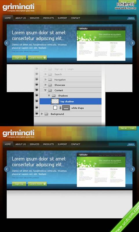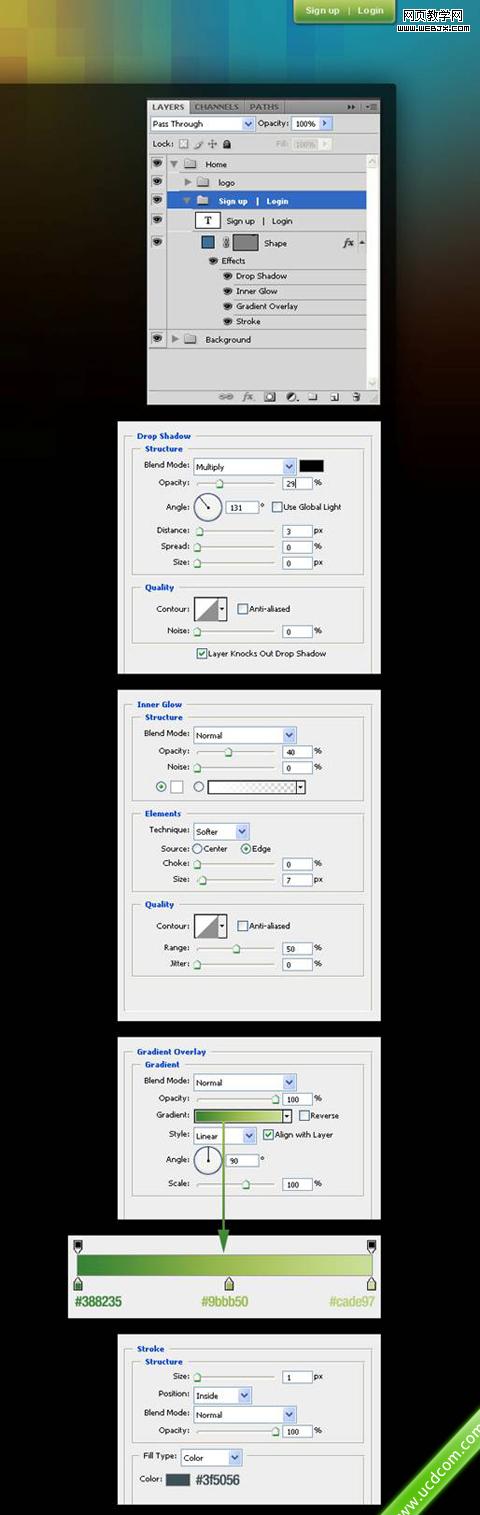 第8步:“注冊”和“登錄”按鈕現在我們要建立兩個按鈕在右上角。創建一個新組并將其命名為“sign up | login”。然后選擇圓角矩形工具( u )和創建一個圓角矩形。雙擊形成的層,打開圖層樣式窗口的設置和使用的下列形象。設置前景顏色為白色,使用文字工具( t )的輸入 “sign up | login”的按鈕。設置不透明的文字層至75 % 。