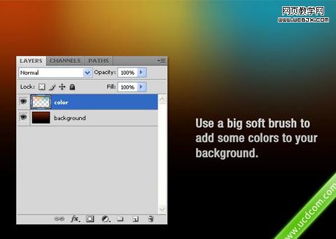 第2步:創建一個新層,選擇畫筆工具(b組),選擇一個軟刷直徑300px和添加一些顏色您布局。我用紅色,橙色和藍色命名此層"color"。