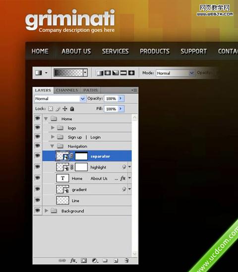 第17步:層單擊“separator”層在圖層調色板以選中它,然后轉到圖層“圖層蒙版”顯示所有。選擇漸變工具( g )從黑色到透明梯,從頂部到中東的拉漸變。