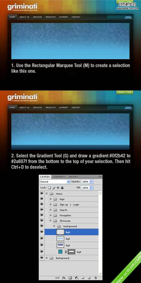 步驟28:創建一個新層,選擇矩形選框工具( m )。選擇漸變工具( g )#0f2b42到#2a607f,從底部到頂部。然后按ctrl+ d鍵取消。命名此層“bg1”.