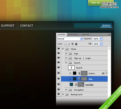 步驟21:創建一個新組,將它命名為“search”并把它放在 “navigation”組的上面。選擇圓角矩形工具( ü ) ,設置半徑為3 px和創造一個圓角矩形,我沒有使用顏色# 104f59 。 命名此層“text field” ,并設置其不透明度為80 % 。