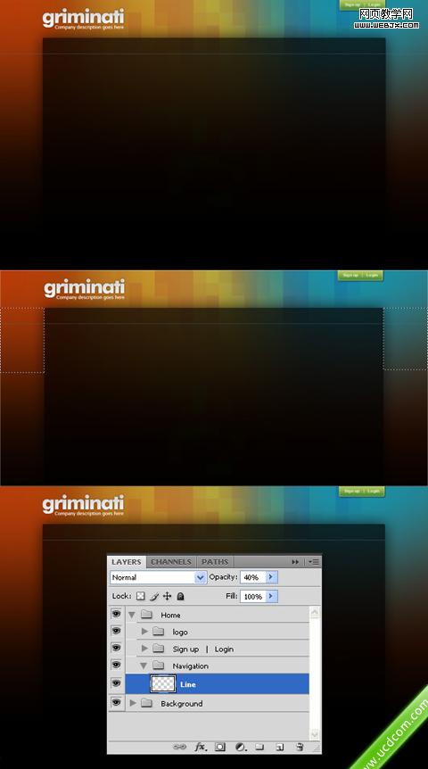 第9步:創建一個新組并將其命名為“navigation” 。創建一個新層,選擇單列選框工具,然后單擊您的文件后,創建一個高度1px 。填補這一選擇顏色# 406f94 。設置這一層不透明的40 % ,并將其命名為“line” 。
