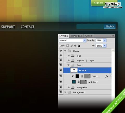 步驟23:在上按鈕寫“search” 使用白色。設置不透明為75 % 。