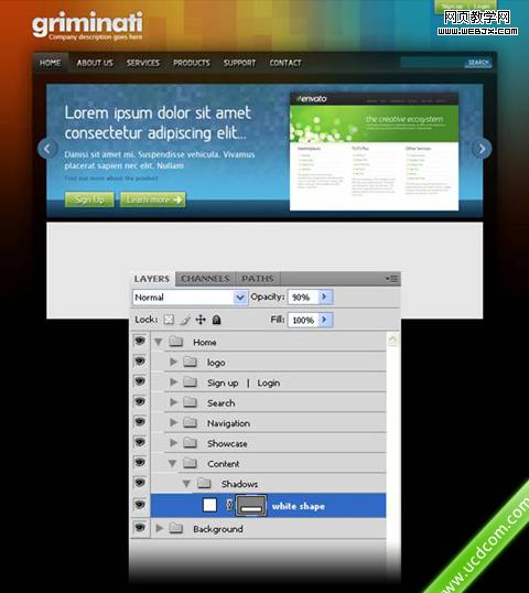 步驟37:建立一個白色長方形 ,創建一個新組并將其命名為“content。”創建另一個組內本,并將其命名為"shadows."。選擇矩形工具( u )和創建一個矩形,我沒有使用白色。命名此層"white shape"并設置其不透明度為90 % 。