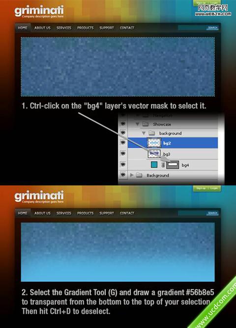 步驟27:添加一個藍色矩形按ctrl -點擊“ bg4 ”層,選中矢量遮罩,然后再創建一個新層,選擇漸變工具( g )#56b8e5到透明從底部到頂部。然后按ctrl + d鍵取消。