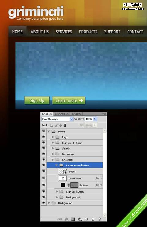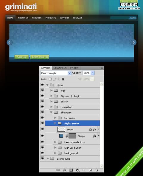 步驟30:重復上一步創建另一個按鈕,但是這一次寫的話“learn more”在您的按鈕。然后創建一個新層,選擇自定義形狀工具(u)和建立一個白箭像我做到了。