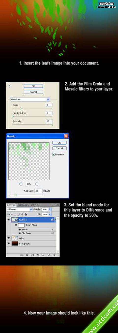 第3步:添加一個紋理的背景,下載煙葉(在本教程上方所需素材)點擊這里下載。右鍵單擊該層,并選擇轉換為智能對象。然后進入過濾器“藝術”膠片顆粒和使用的設置以下的形象,然后進入過濾器“ pixelate ”馬賽克,并再次使用設置以下設置混合模式為這層差異,不透明度為30 % ,并將其命名為"texture"