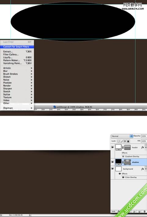 4,選擇前景色為黑色。選擇橢圓工具,創(chuàng)造的形狀。使它成為一個(gè)高于白色矩形如圖所示。下移一層,將其轉(zhuǎn)換為智能過(guò)濾器,采用高斯模糊,并改變不透明度為60 %。