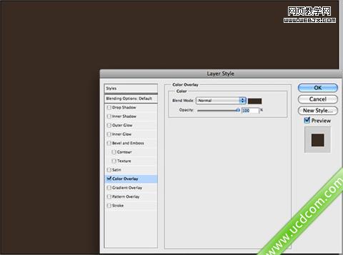 1、新建文件大小為1000x750px,雙擊圖層“圖層樣式”顏色疊加:#深棕色