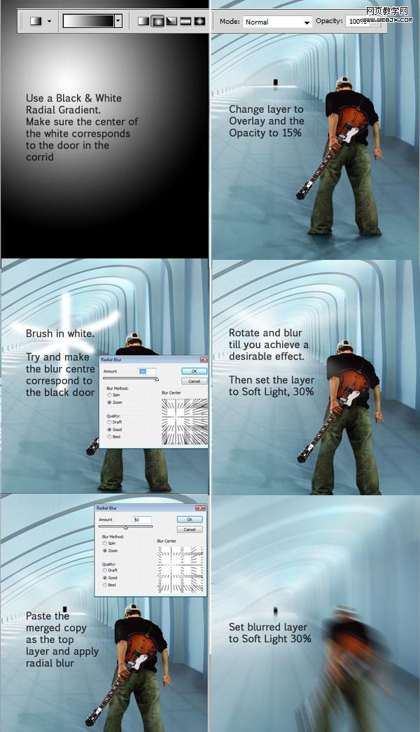 使用漸變工具,描繪一個光影效果,徑向模糊濾鏡打造動感特效。
