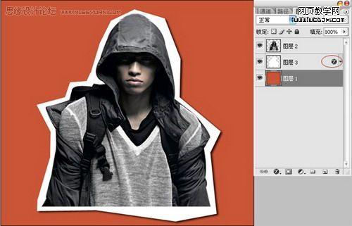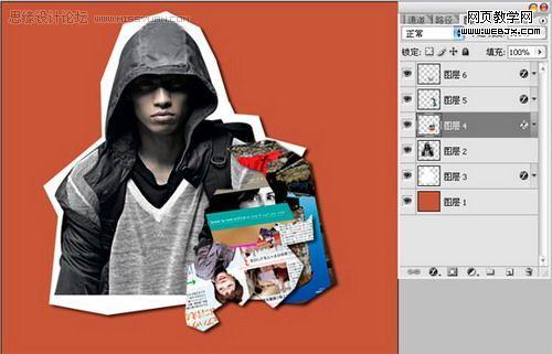 第4步,找些雜志頁面把它們不規則的扣下來,放入文件中,放在人物右上面,并加陰影