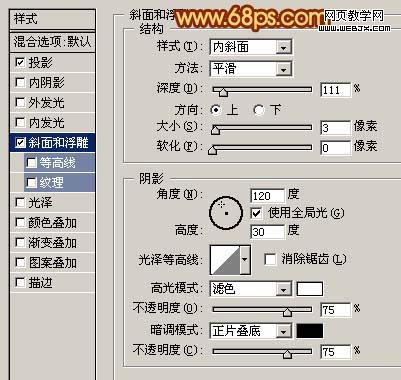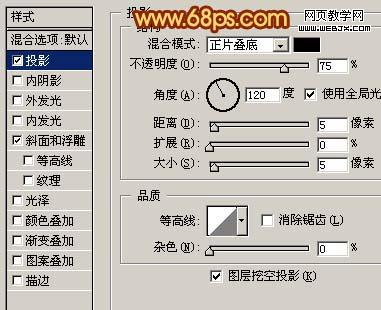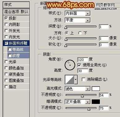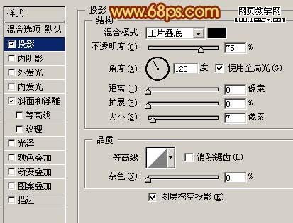 9、雙擊圖層面板,木板圖層縮略圖調(diào)出圖層樣式,分別設(shè)置投影,斜面和浮雕,參數(shù)設(shè)置如圖12,13,效果如圖14。