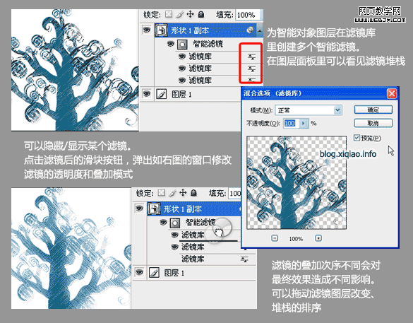 智能濾鏡是指針對智能對象應用的一些濾鏡,在濾鏡庫里可以瀏覽濾鏡菜單,預覽并對統一對象使用多個濾鏡。