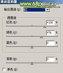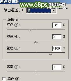 3、創建通道混合器調整圖層,參數設置如圖7,8。確定后只保留房子部分,其它部分用黑色畫筆擦掉,效果如圖9。