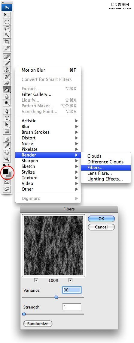 步驟3:首先選擇黑色為前景色,適中的灰色為背景色。去濾鏡>渲染>纖維。設(shè)置方差為36,強(qiáng)度為1。