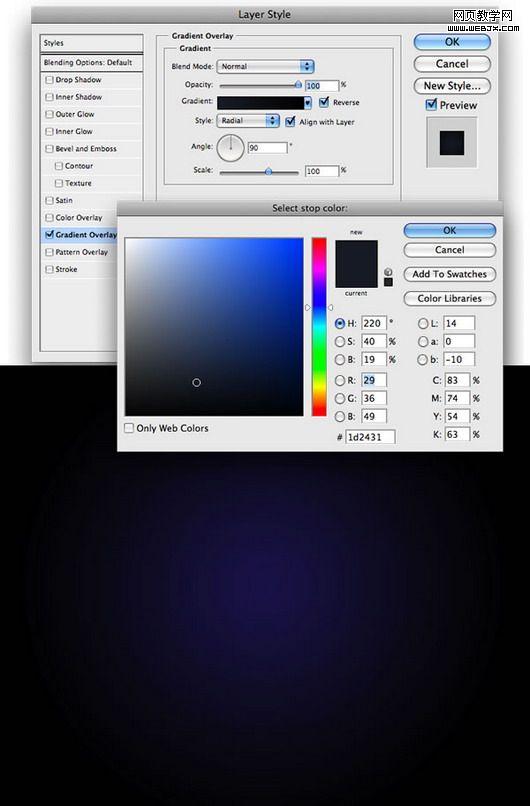 步驟1:創(chuàng)建一個新文件。雙擊背景圖層打開圖層風(fēng)格。選擇覆蓋漸變,使用黑色和一個深藍(lán)色。選擇漸變風(fēng)格里的徑向漸變。