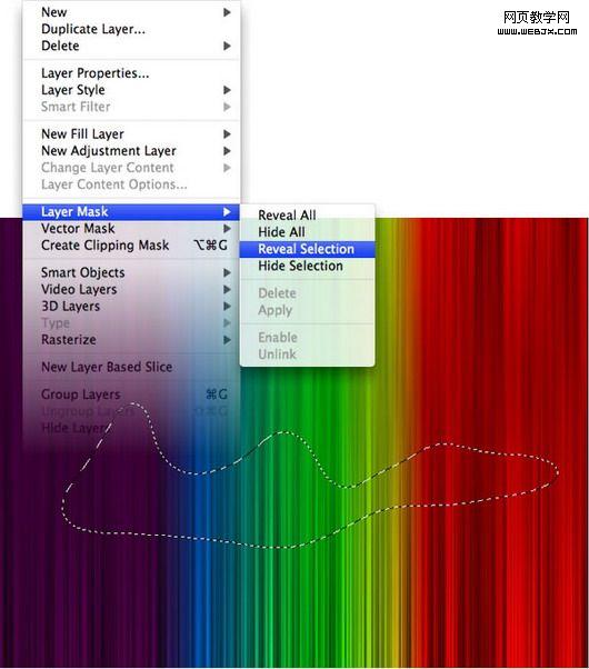 步驟6:使用套索工具(l),設(shè)置羽化范圍30px,創(chuàng)建一個不規(guī)則選區(qū)(可以按自己的喜好畫)。之后去圖層>圖層蒙版>顯示選區(qū)。