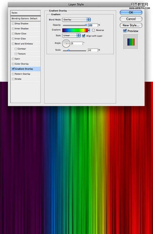 步驟5:打開圖層風(fēng)格對話框(雙擊模糊層)。選擇覆蓋漸變,混合模式為疊加。我使用了彩虹的顏色:從紫色開始、藍(lán)、綠、黃、紅。我喜歡這些顏色:)