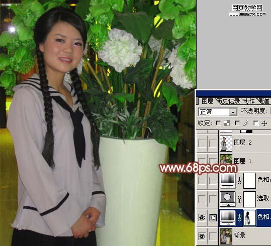 1、打開原圖素材,創建色相/飽和度調整圖層,參數設置如圖1,2,確定后用黑色畫筆把人物部分擦出來,如圖3。
