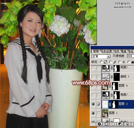 5、按ctrl + alt + ~ 調出高光選區,新建一個圖層填充白色。把圖層不透明度改為:30%,加上圖層蒙版只保留人物部分,其它部分用黑色畫筆擦掉。