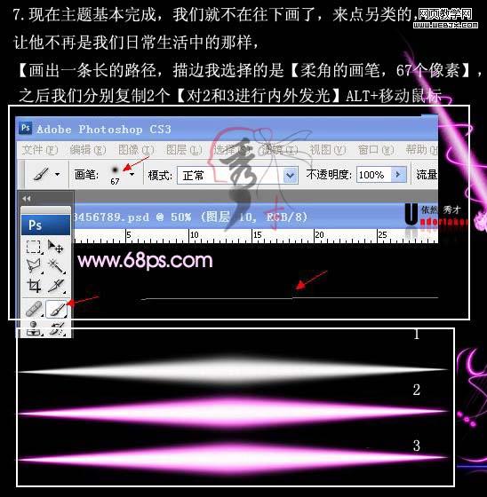 7、畫出一條長(zhǎng)的路徑,描邊我選擇的是柔角的畫筆,67像素大小。之后我們分別復(fù)制2個(gè),對(duì)副本2和3進(jìn)行內(nèi)外發(fā)光,按alt + 移動(dòng)鼠標(biāo)復(fù)制。