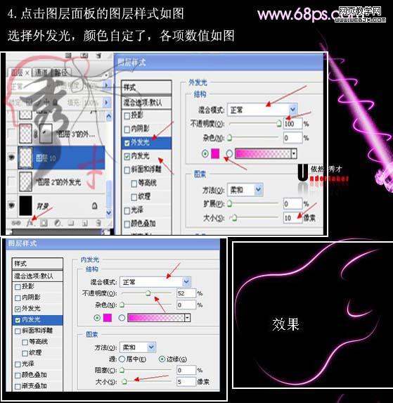 4、點(diǎn)擊圖層樣式,里面的內(nèi)發(fā)光和外發(fā)光,接下來(lái)的發(fā)光也都是一樣的設(shè)置,所以就不在截圖了。