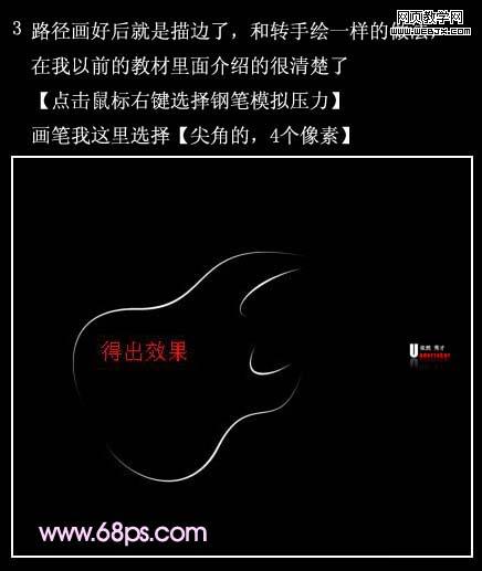 3、路徑畫好后就是描邊,和轉(zhuǎn)手繪一樣的做法,在我以前的教材里面介紹的很清楚了(點(diǎn)擊鼠標(biāo)右鍵選擇畫筆描邊,勾選模擬壓力)。畫筆我這里選擇尖角,4像素大小。