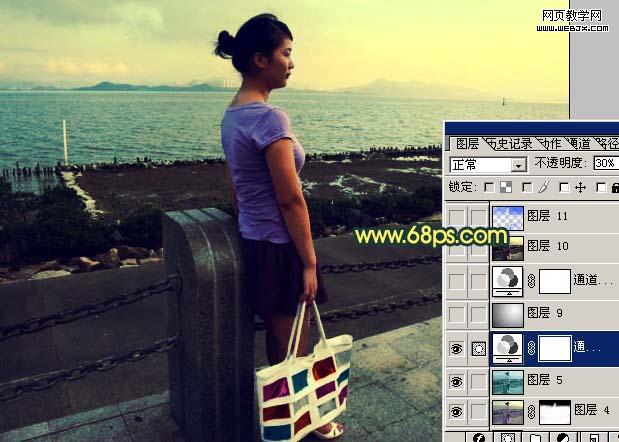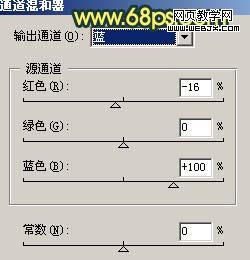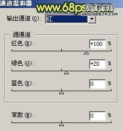5、創建通道混合器調整圖層,對紅色及藍色進行調整,參數設置如圖7,8,確定后把圖層不透明度改為:30%,效果如圖9。