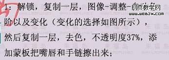 1、打開原圖素材,雙擊圖層解鎖,選擇菜單:圖像 > 調(diào)整 > 自動(dòng)色階以及變化(變化的選擇如下圖)。然后把背景圖層復(fù)制一層,按ctrl + shift + u 去色,把圖層不透明度改為:37%,添加圖層蒙版用黑色畫筆把嘴唇和手鏈擦出來。
