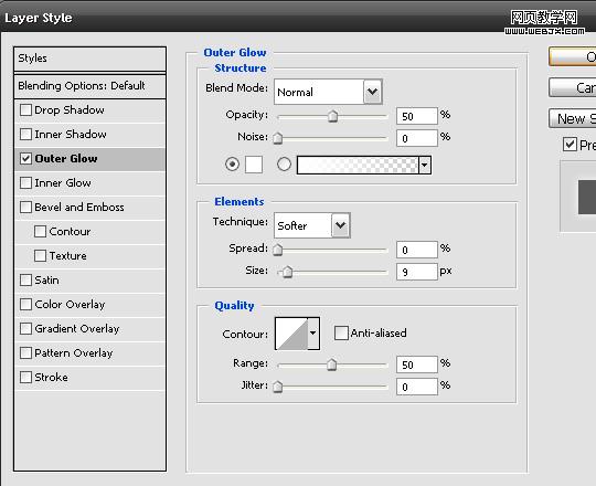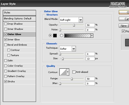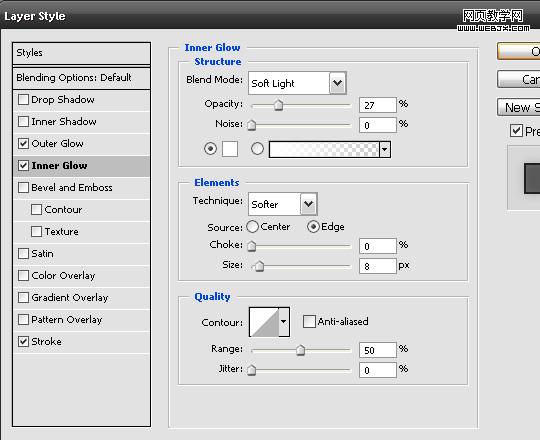 第十二步:選擇圖層樣式>外發光(柔光)>內發光>描邊