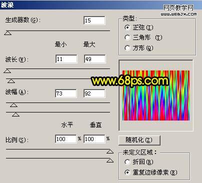 2、對漸變層執(zhí)行:濾鏡 > 扭曲 > 波浪,參數(shù)設(shè)置如圖2,效果如圖3。