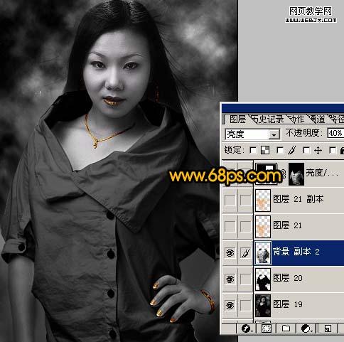12、把衣服圖層復制一層,圖層混合模式改為“亮度”,圖層不透明度改為:40%,再把摳出的衣服原層填充黑色,效果如下圖。