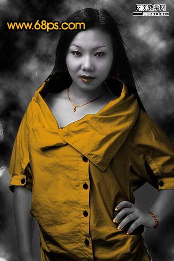 13、按ctrl + alt + ~ 調出高光選區,新建一個圖層填充顏色:#e69900,取消選區后加上圖層蒙版,只保留衣服部分,其它部分用黑色畫筆擦掉,如圖20,然后把圖層混合模式改為“疊加”效果如圖21。