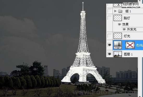 9、創建路燈及效果。點擊圖層面版下方的“創建新圖層”按紐,命名為“路燈”。選取“路燈”圖層,選取畫筆工具,設置“柔角”筆尖,“硬度”降為“0”。打開“拾色器”,把前景色設置為“淺黃”,具體如下圖。用設置好的畫筆工具在圖像上“鐵塔”后的“圍墻”上方依次點擊,創建路燈。選取“路燈”圖層,在縮略圖外的空白部分雙擊,調出“圖層樣式”,并選取“外發光”,打開“外發光”設置面版,具體設置如下圖。調大畫筆,畫筆不透明度設為“15%”左右,在“路燈”經過的地方涂抹,制造光暈。