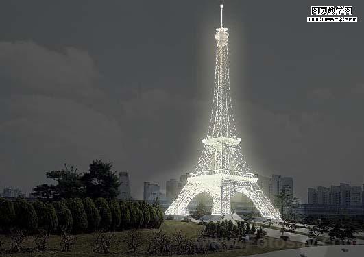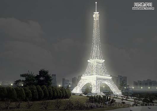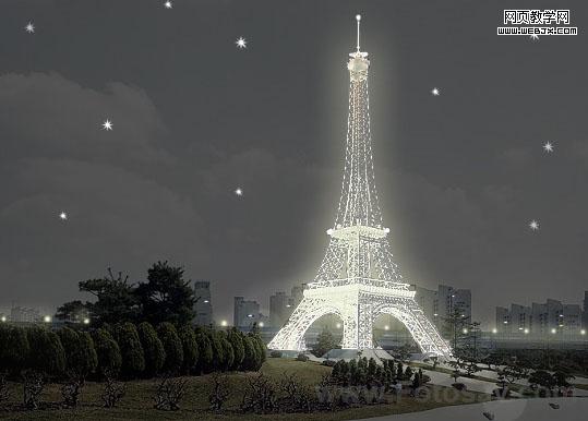 大致過程:把照片一些較大的建筑物摳出來,進行反相并加上一些發光效果,這樣就有一種霓虹的感覺,然后再把背景部分調暗更顯黑夜效果。最后就是一些裝飾素材的添加。