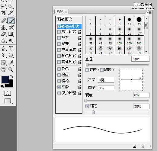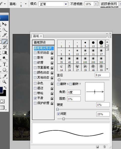 10、創建房屋燈光。新建圖層,命名為“燈光”,選取該圖層。按f5調出畫筆面版,選取柔角5相素左右的筆尖,將圓度降為“0”,設置前景色為白色(可以根據需要進行不同顏色設置以營造出不同顏色的燈光),在房屋的窗戶上點擊,營造出燈光效果。