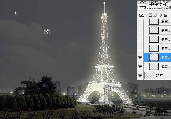 13、復制星星。以“星星1”和“星星1副本”為樣本,按下alt鍵的同時,移動“星星”,復制出多個星星,并移動到圖像的適當位置。對星星可以重復執行ctrl+t命令改變星星的大小,同時可以選擇相應圖層,降低相應星星圖層的“透明度”,制度星星間的明亮度,從而營造出星空效果。最后執行“shift+ctrl+e”合并圖層,得到最終效果圖。